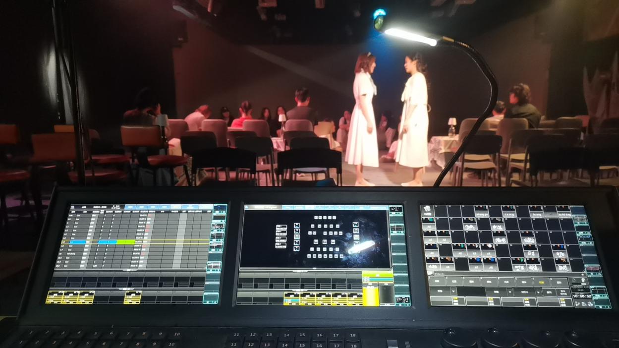 此次毕业展演与南航艺术学院戏剧影视美术设计专业开展深入合作,通过《戏剧影视灯光设计》《人物造型设计》《虚拟空间设计》等课程,开展跨学科融合。南航艺术学院的学生运用AI技术进行舞美设计,利用文本生成模型快速构建场景概念草图,通过CAVE空间多通道视景同步技术以及舞台光影技术,实现规定情景的虚拟场景重建和舞台场景的实时动态切换,使观众能够沉浸式观演。南航2022级戏剧影视美术设计专业学生刘泰源是本次剧目的多媒体设计/执行灯光,他提到,在技术上最大的难度在于,AI的能力并没有想象中的那么强大,至少在视频成形方面,需要投入大量时间对AI生成的内容进行反复优化和调整。创作团队面对问题时也不断进行改进,直至呈现出满意的舞台效果。