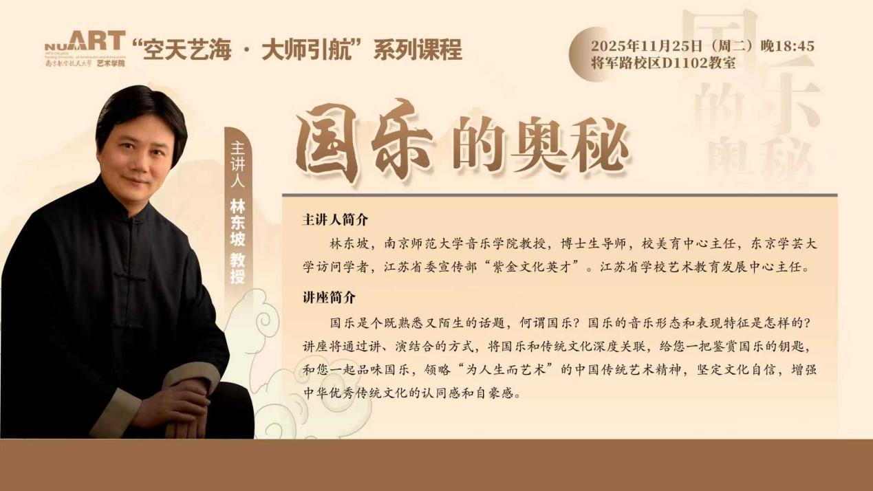 “国乐不仅是艺术形式,更是中华文明的精神载体。”11月25日晚,南京师范大学美育中心主任、音乐学院林东坡教授做客我校,为百余名学子带来一场别开生面的美育讲座《国乐的奥秘》。这不仅是知识的讲解,更是一场沉浸式的国乐体验,当天还有个别同学参与了现场互动,随林教授学习了二胡的基本演奏技巧。