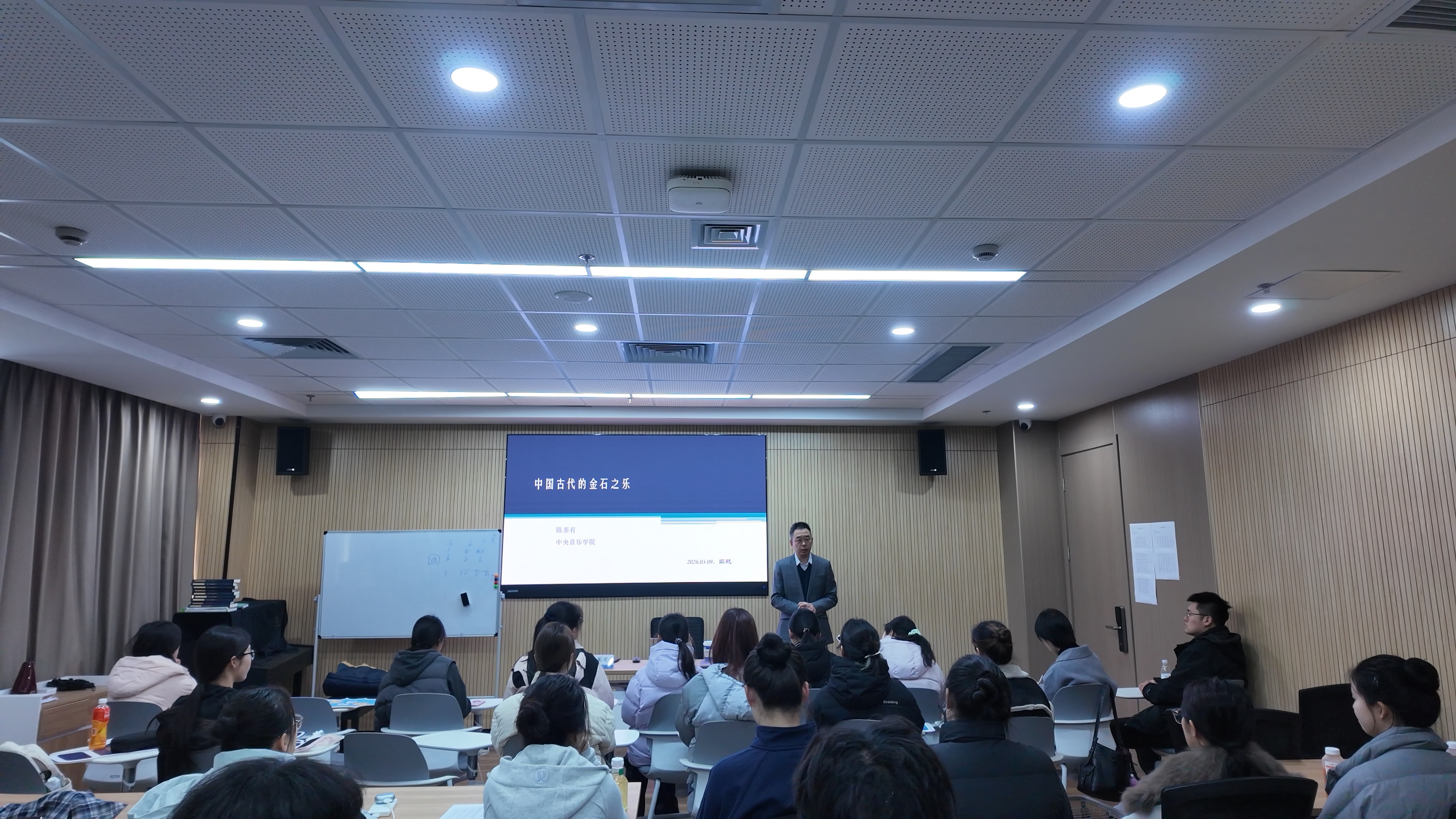 陈荃有教授深耕中国音乐史、音乐编辑学和礼乐研究,学术成果丰硕。讲座伊始,陈教授以“器、乐、礼”为线索,从古代的“八音分类法”切入,系统讲解金石之乐的文化内核:金石作为八音核心,金以钟为代表、石专指磬,是古代礼乐的标志性载体,其发展始终与中华文明的进程紧密相连。